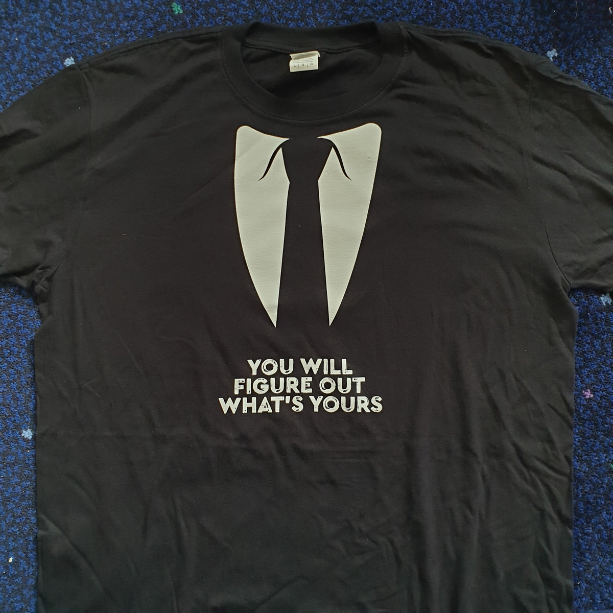 Purple t-shirt featuring the infamous lines from Black Tie.